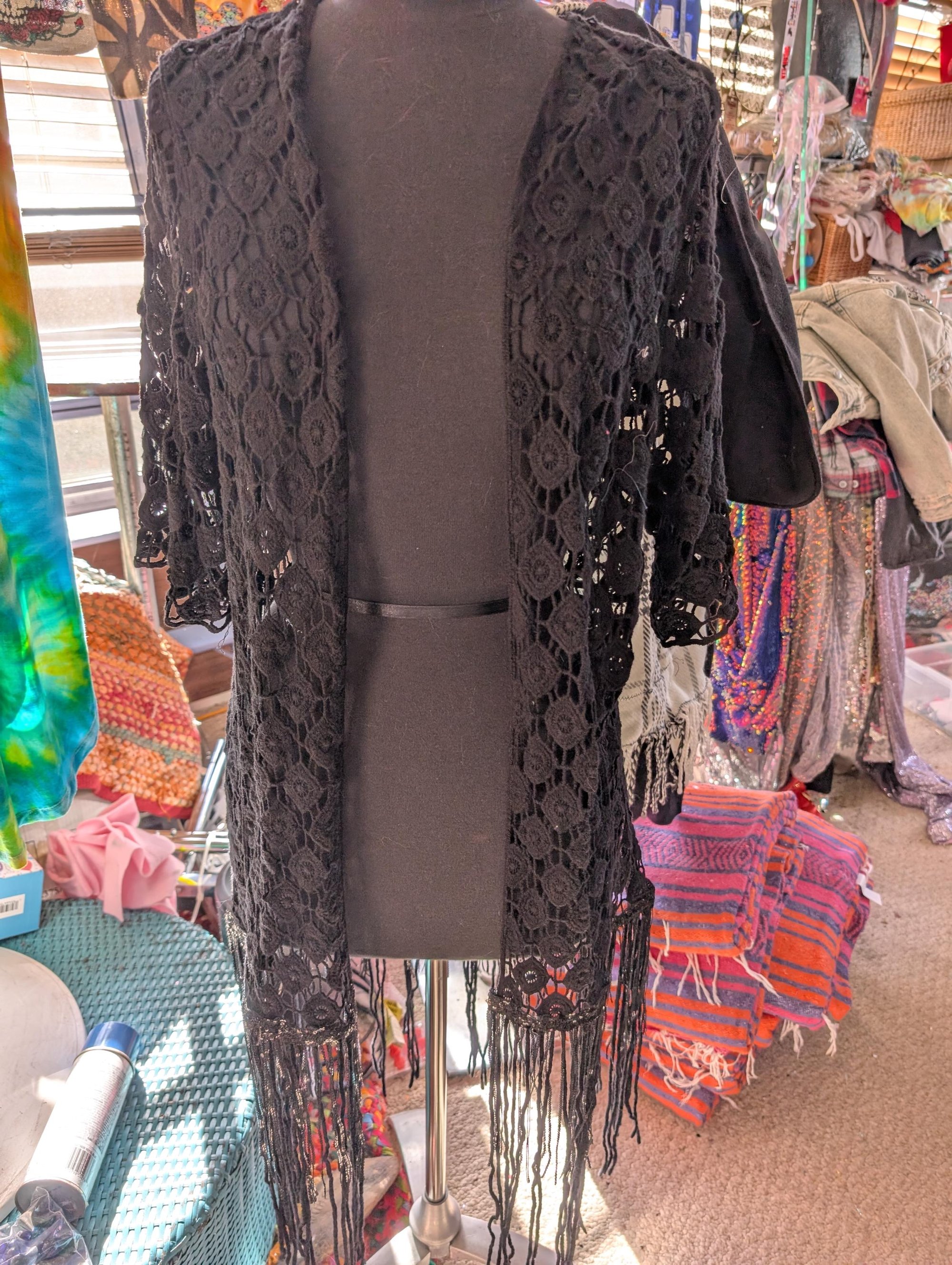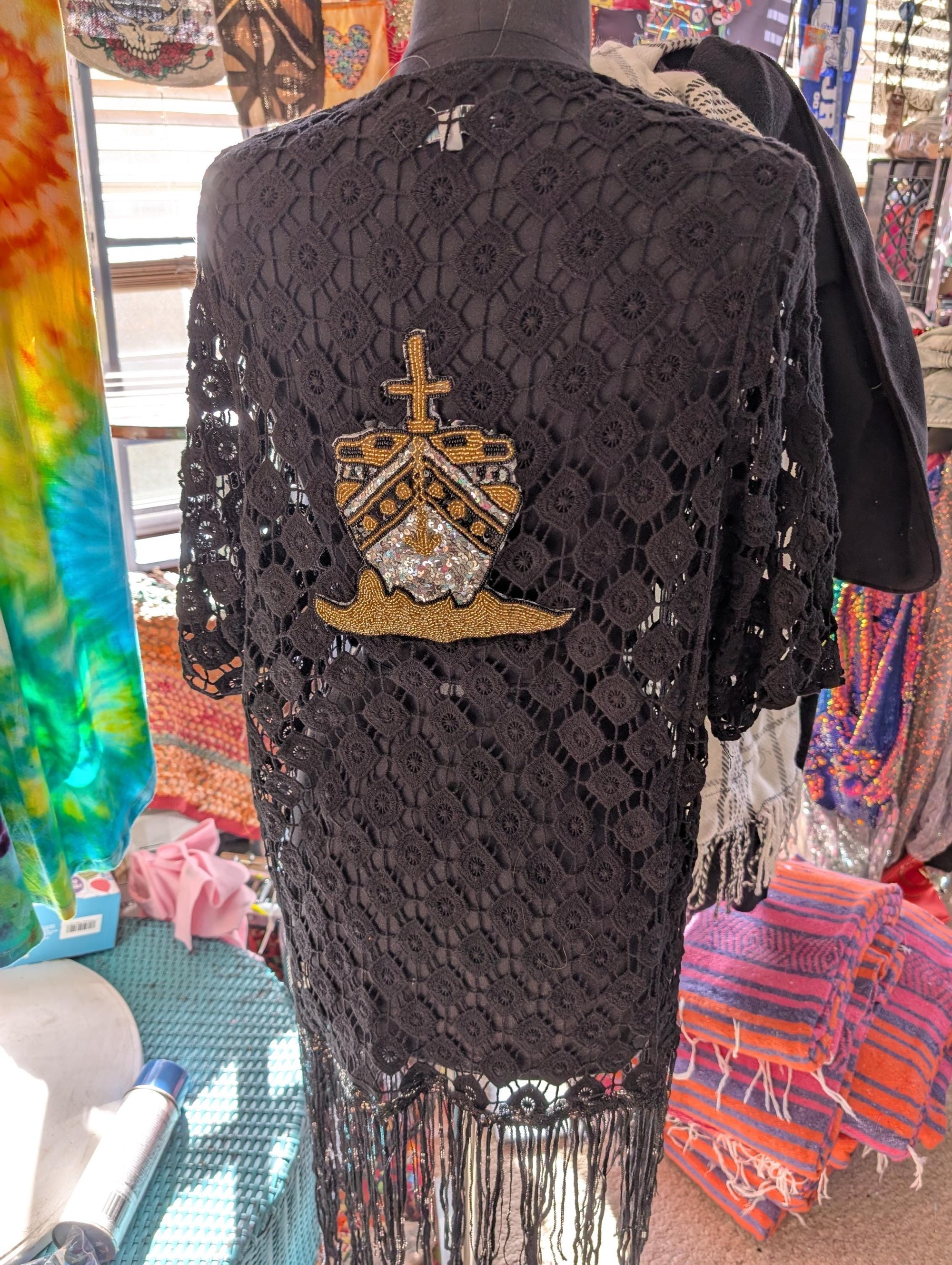 Waist length black Floral kimono with vintage beaded cruise ship applique. size large