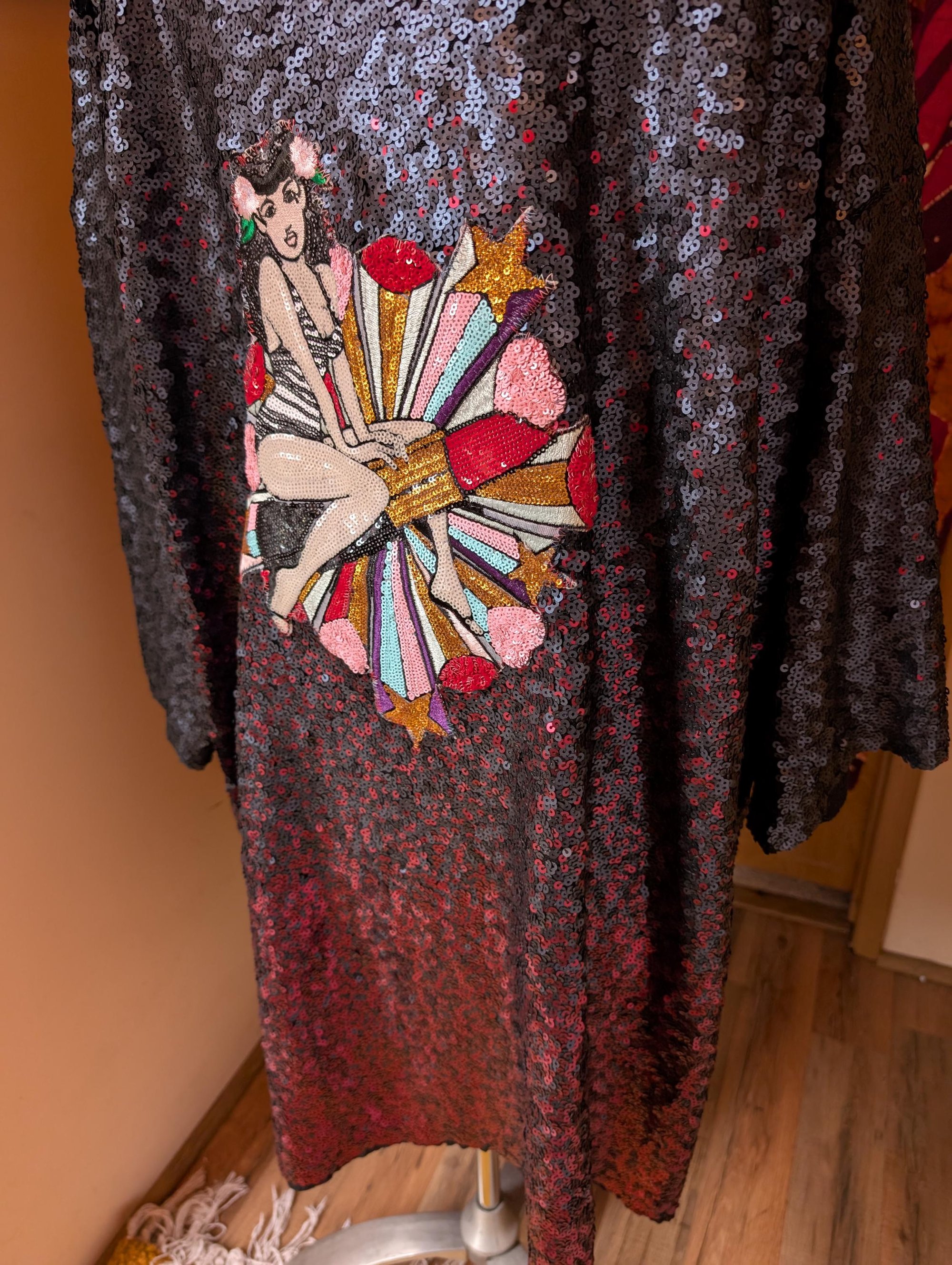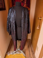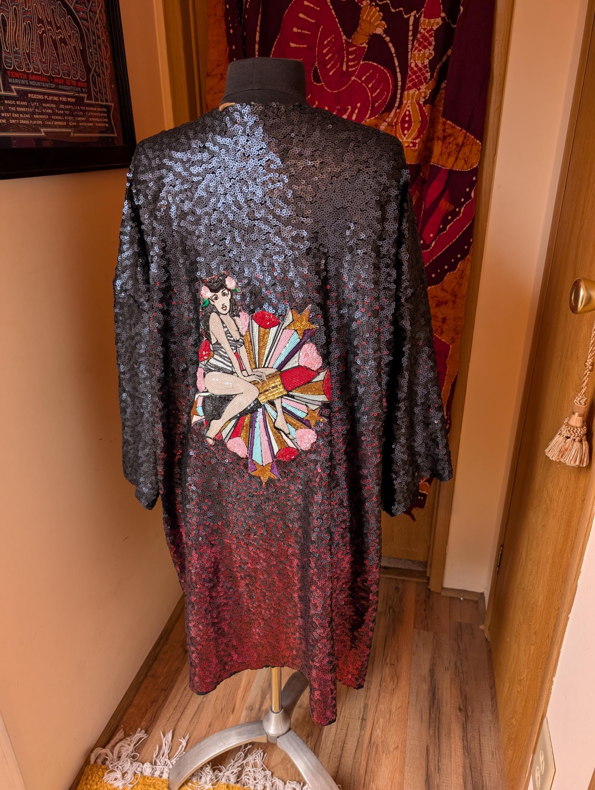 lipstick pinup Sequin patch on ombre kimono. all kimonos are one size fits most. all kimonos are made from the same pattern and have been tried on by up to a woman's 4x. kimono are for all genders. they are super versatile and ideal for layering. fringe can be added to any kimono, check out our adding fridge listing.