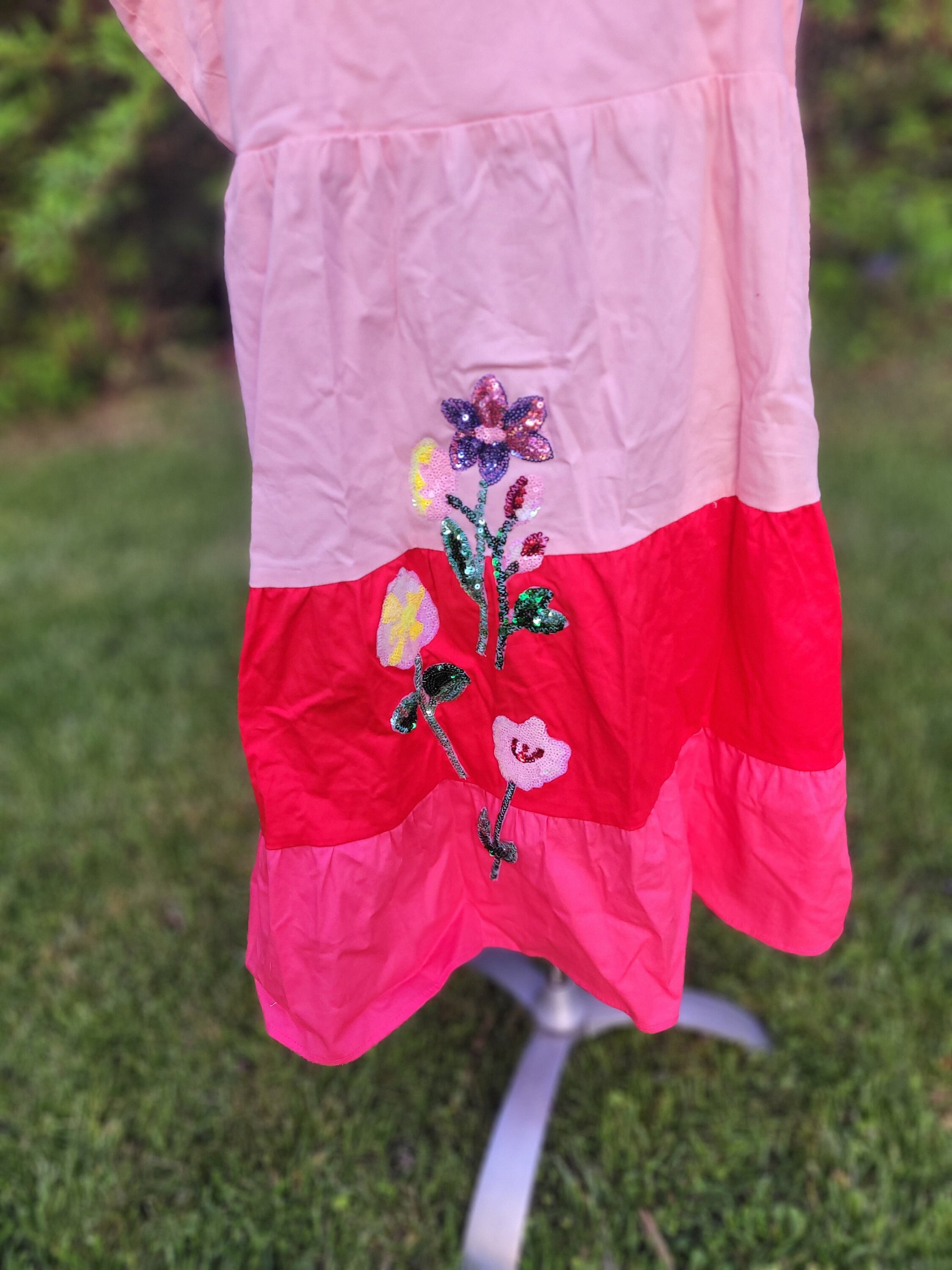 Pink ombre tiered dress with floral patchwork xl
